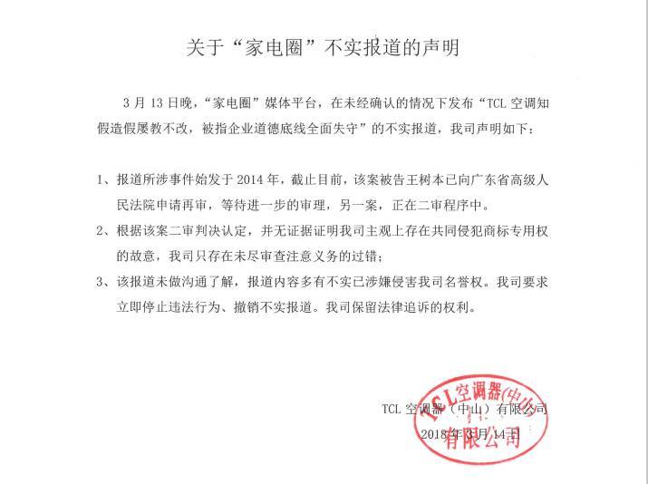 面對“鐵一般的事實”,TCL空調(diào)卻指責家電圈上述披露的信息“失實”,并在聲明函中強調(diào),“報道所涉事件始發(fā)于2014年,截止目前,該案被告王樹本已向廣東省高級人民法院申請再審,等待進一步的審理;另一案,正在二審程序中”。同時,還進一步強調(diào),“根據(jù)該案的二審判決認定,并無證據(jù)證明我司主觀上存在共同侵權商標專用權的故意,我司只存在未盡審查注意義務的過錯”。