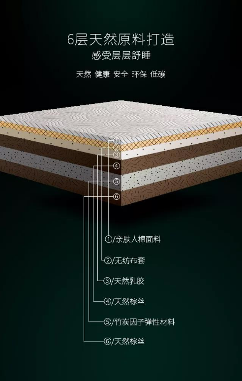 大自然山棕床墊3月新近推出的“清雅”系列床墊更是大自然床墊三段式設(shè)計(jì)理論的經(jīng)典之作。清雅床墊總體結(jié)構(gòu)分為六層,床墊支撐層首次采用6CM竹炭因子彈性材料和上下各5CM厚的天然棕絲植物纖維內(nèi)膽三層結(jié)構(gòu),超強(qiáng)支撐不變形,循環(huán)透氣,為身體各區(qū)域提供最恰當(dāng)舒適的承托;6cm竹炭因子彈性材料持續(xù)吸附異味,釋放活氧,調(diào)溫排濕,凈化睡眠環(huán)境;精選天然面料和彈性材料,構(gòu)建床墊的緩釋層和舒適層,從而滿足不同人群對(duì)于床墊支撐性及舒適性的需求。
