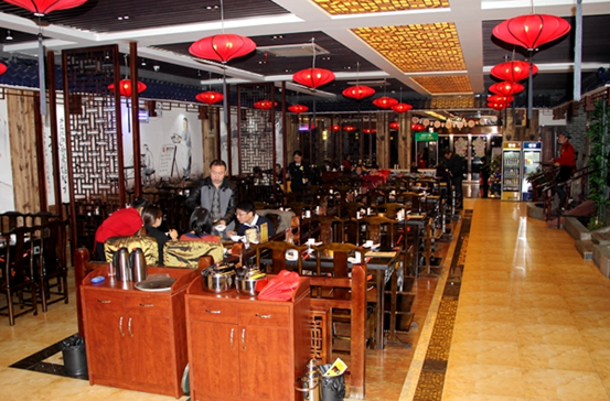 一進(jìn)店門,第一個(gè)感受就是“古”。古色古香的裝修,精致素雅的壁畫,頗有些明清老茶館的味道;而熱鬧與雅致并存的動(dòng)靜分區(qū),又令人仿佛置身于《清明上河圖》畫中;點(diǎn)綴其間假山、魚(yú)池、綠植,更在不經(jīng)意間流露出主人巧妙的心思。