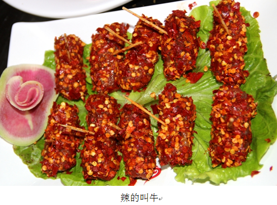 喜歡吃辣的人可以試試這道“辣的叫牛”,也是朝天門的特色之一。不常吃辣的人通常看到外面裹著紅艷艷的辣椒就望而卻步了,其實(shí)乾坤還在牛肉里面。我試著將外面的辣椒煮掉以后只吃牛肉,結(jié)果剛咬了一口,眼淚就出來(lái)了。至于秘密何在,想知道的人不妨親自嘗一嘗。著名主持人海峰對(duì)這道菜評(píng)價(jià)很高,說(shuō)一吃就忘不了,超級(jí)辣、瘋狂的辣、回味的辣。