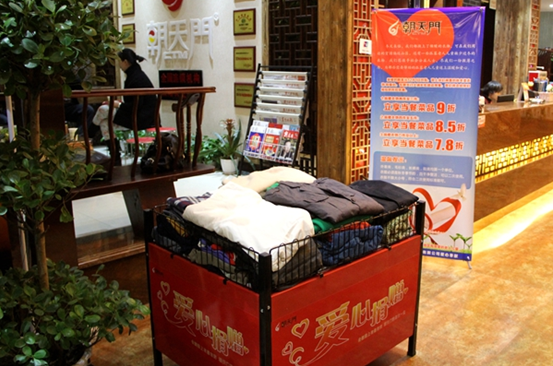 值得一提的是,朝天門火鍋店目前正在做一個(gè)慈善活動(dòng)。顧客只需要將自己不用的秋冬衣物拿去店里,就可以享受7.8—9折的優(yōu)惠。而這些衣物,將會(huì)捐獻(xiàn)給貧困山區(qū)。