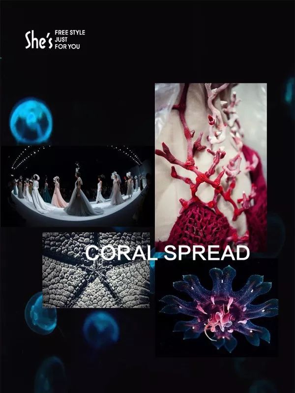 She''''''''s:“Abyssal Wonderland懸浮秘境”。寂靜黑暗的海洋盡頭涌動(dòng)著令人驚嘆的流光溢彩:礁石與生物在雜亂無章地運(yùn)動(dòng),于虛無縹緲的光彩中相互混合;植物與動(dòng)物在融合、蛻變,綻放出斑斕華麗的新生……通過藝術(shù)化的配飾表達(dá)方式,來呈現(xiàn)水下生物的自然形態(tài),這些作品將在懸浮秘境中成為穿透黑寂的光芒。