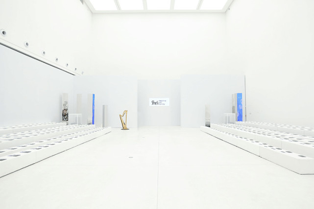 秀場布置的十分簡潔,一抹色的白夾了兩塊透亮如海水的藍~