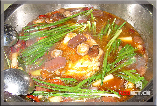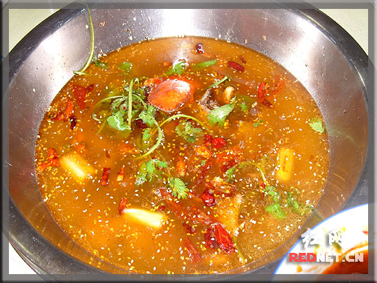 第二道是該店的招牌特色口味蟹,價格是40元一斤,一般,我們要了一個大份的量。上菜挺快,點菜后不到五分鐘就有一大盆口味蟹上桌,嫩綠的生香菜打底,鋪上炸得紅紅脆脆的螃蟹,作為紅綠的大眾配,在色相上還算不錯。有人眼睛尖,居然發(fā)現(xiàn)蟹腿上有些附著的黑點,并很快達(dá)成共識,這可能屬于秘方系列,可惜店老板似乎沒在,未能進(jìn)一步求證。這道口味蟹,大約三分之一的蟹殼有紅紅的蟹黃,口感和咸蛋黃類似,要鮮一些。吃蟹肉,咸淡合適,感覺鮮香還算不錯,但辣味不猛,沒有夏日喝啤酒吃口味夜宵的以水澆火的感覺,湖湘特色的火辣辣未能體現(xiàn),可以說口味比較全國化。我個人喜好將蟹腳逐個咬碎,讓熬在里面的湯汁在舌尖上滾蕩出一把鮮香來,據(jù)說還補鈣,這是題外話了。