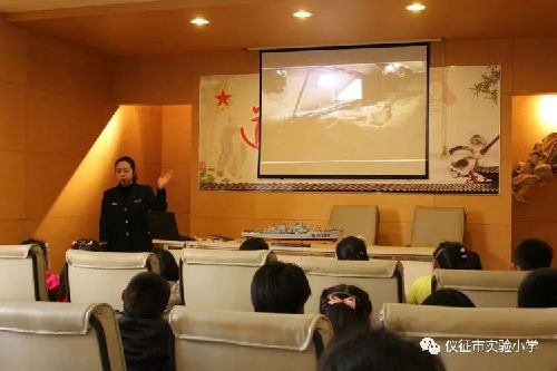 英姿颯爽的解放軍姐姐作了“心系海軍、夢逐深藍”主題教育講座,給大家展示了海軍軍旗,并對艦艇、潛艇、航母等海上武器裝備如數(shù)家珍。同學(xué)們聽得津津有味!