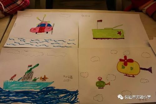 孩子們紛紛拿起畫筆,描繪他們心中的海軍藍圖,藍天白云、飛機艦艇、蔚藍的大海、飄揚的旗幟……五彩繽紛、躍然紙上。