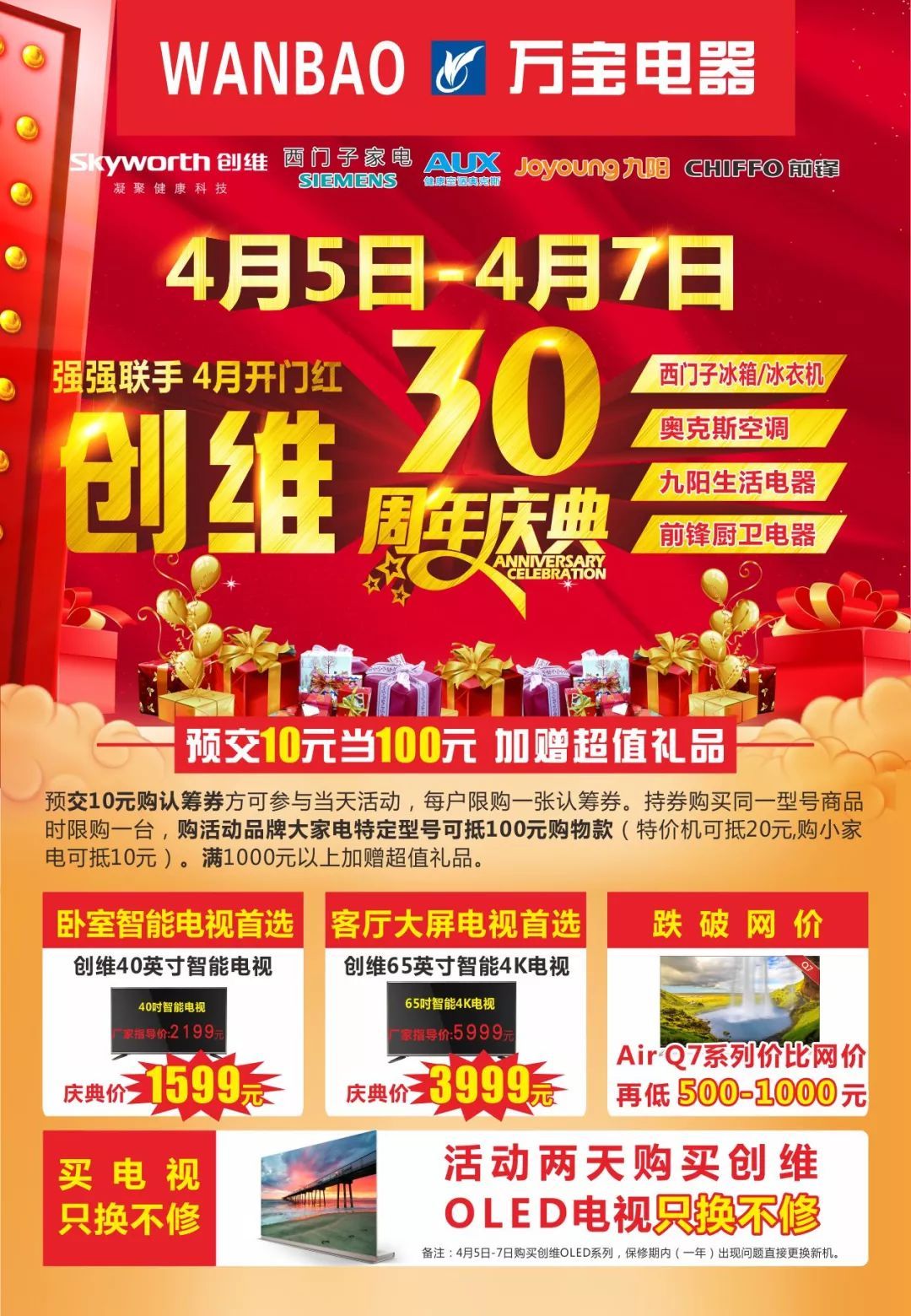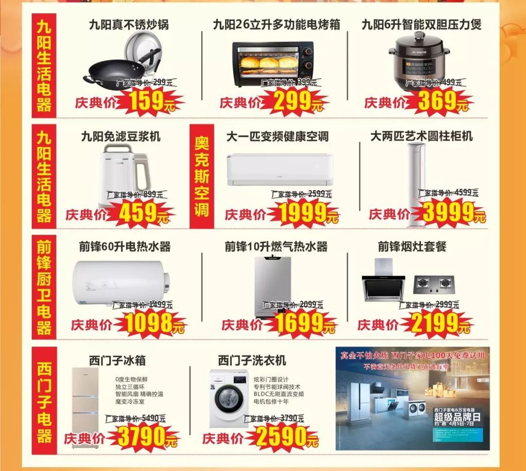 創(chuàng)維40英寸智能電視慶典價1599元、Q7系列電視比網(wǎng)價再低500~1000元。活動期間購OLED電視,一年內(nèi)只換不修!九陽26立升電烤箱慶典價299元!奧克斯大一匹空調(diào)1999元!西門子冰箱慶典價3790元!西門子洗衣機(jī)慶典價2590元!前鋒60升電熱水器1098元!時尚美食大課堂開講啦,美食免費(fèi)代加工!點(diǎn)擊下方“閱讀原文”微信報名,我們將安排專人與您聯(lián)系