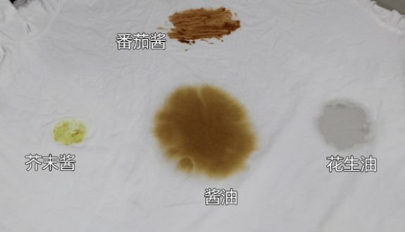 我們把一件純棉的T恤涂抹上醬油、花生油、芥末醬、番茄醬,然后扔進(jìn)洗衣機(jī)采用標(biāo)準(zhǔn)洗程序,對(duì)比每一款洗衣機(jī)清洗以后的效果。