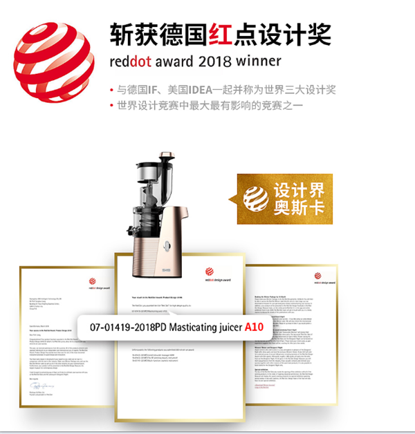 據(jù)了解,SKG原汁機(jī)A10經(jīng)過(guò)兩年研發(fā)推出的新一代大口徑無(wú)渣原汁機(jī),擁有18項(xiàng)專利,首創(chuàng)2合1無(wú)刷壓榨,3步盲裝,致力于全方位打造高顏值的“營(yíng)養(yǎng)提取機(jī)”。A10原汁機(jī)憑借著出色的設(shè)計(jì)和高顏值的形象,在今年斬獲家電業(yè)全球最權(quán)威的“紅點(diǎn)獎(jiǎng)”,足見(jiàn)實(shí)力。