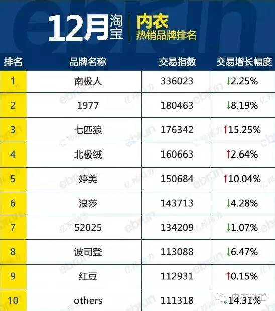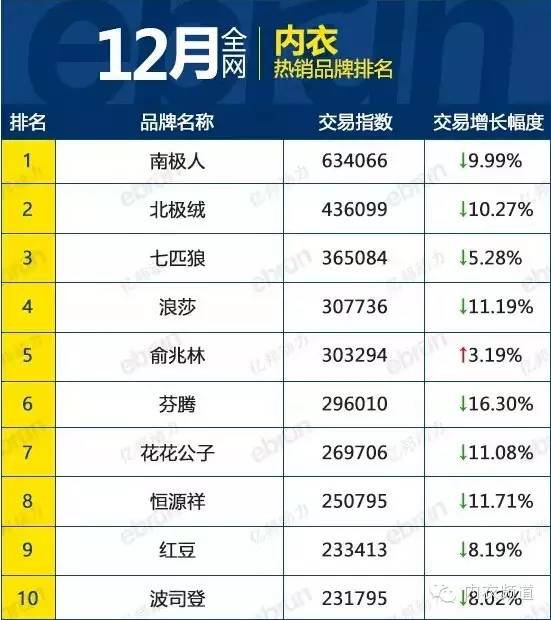 原標(biāo)題:天貓?zhí)詫?2月內(nèi)衣熱銷(xiāo)品牌名單公布,南極人全網(wǎng)居第一