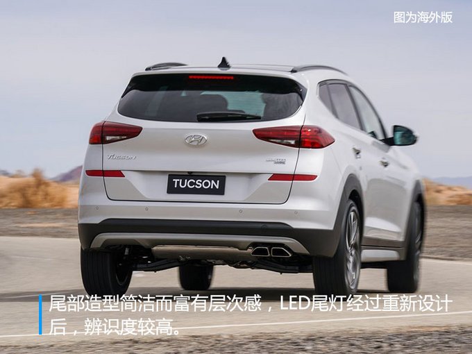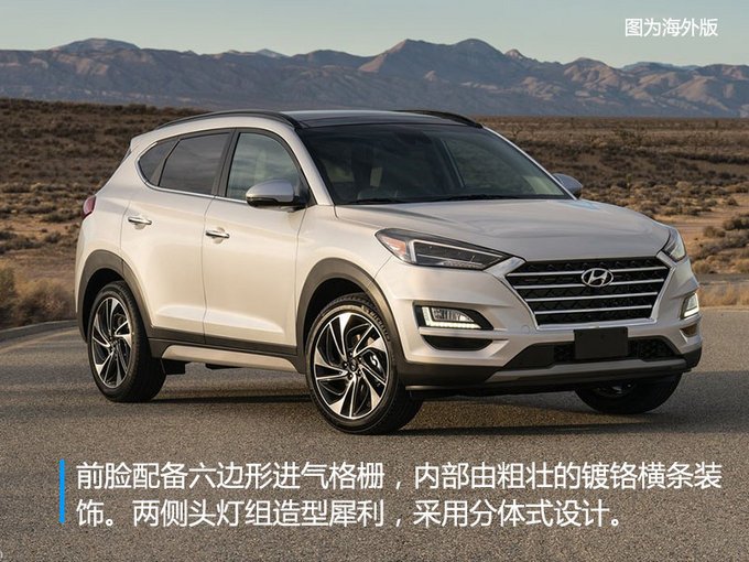 新款途勝前臉配備六邊形進(jìn)氣格柵,內(nèi)部由粗壯的鍍鉻橫條裝飾。兩側(cè)頭燈組造型犀利,采用分體式設(shè)計(jì),內(nèi)部集成“L”型日間行車燈,看起來十分犀利。車身側(cè)面線條流暢,車窗下沿加入鍍鉻元素,選用18英寸鋁合金輪轂。尾部造型簡潔而富有層次感,LED尾燈經(jīng)過重新設(shè)計(jì),點(diǎn)亮后辨識(shí)度較高,排氣為單邊共兩出式布局。