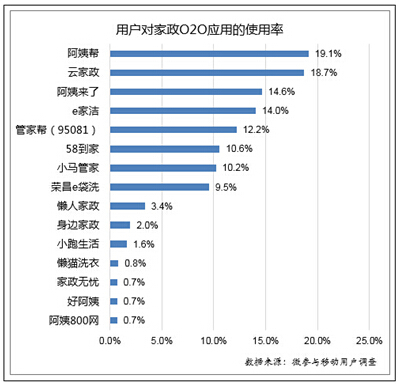 根據(jù)4月22日,比達(dá)咨詢發(fā)布的《2015年Q1家政O2O服務(wù)市場用戶調(diào)查報告》顯示,在用戶對家政O2O應(yīng)用的使用率方面,阿姨幫排名第一,使用率達(dá)19.1%。