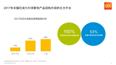 目前,中國(guó)家電產(chǎn)品的線上銷售正處于高速增長(zhǎng)期。GfK數(shù)據(jù)顯示,2017年中國(guó)技術(shù)消費(fèi)品市場(chǎng)零售額達(dá)到21900億元,在線渠道依然是市場(chǎng)增長(zhǎng)的重要推手,其中天貓成為引領(lǐng)數(shù)碼家電線上增長(zhǎng)的第一平臺(tái)。