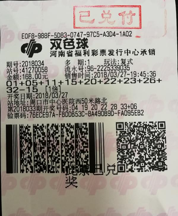 3月27日晚,福彩雙色球第2018034期開出8注頭獎,單注獎金756萬元,其中,河南鄭州、周口彩民各收獲1注,分別出自鄭州市南三環(huán)與工人路附近的41010202投注站、周口市中心醫(yī)院附近的41270058投注站。