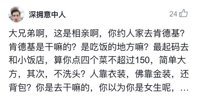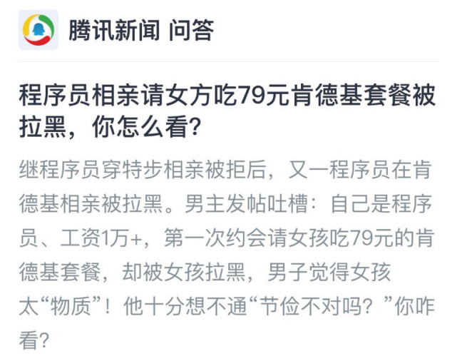 他表示,自己工資1w+,平時很節(jié)儉,住單位宿舍,平時吃食堂,看電影從不去電影院,衣服是網(wǎng)購,手機(jī)是二手的。相親那天,吃飯約在了肯德基,倆人吃了79元套餐,他感覺吃飯的時候聊得挺好,有繼續(xù)發(fā)展的意向,但女方的態(tài)度截然相反,還拉黑了他。男子覺得因為自己窮,女孩太拜金才這樣的,但很多網(wǎng)友卻有不同看法。