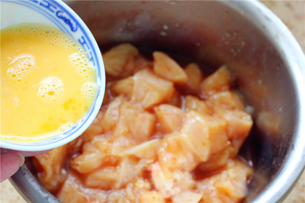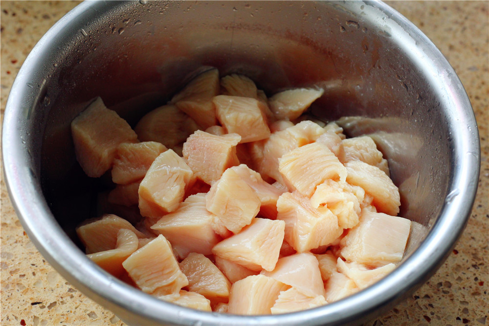 1.準(zhǔn)備雞胸肉洗凈,去除筋膜,用刀背敲打拍松切丁