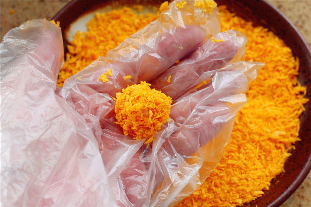 3.取適量面包糠,取雞丁在面包糠中滾幾圈,讓雞丁表面粘上面包糠,用手整圓
