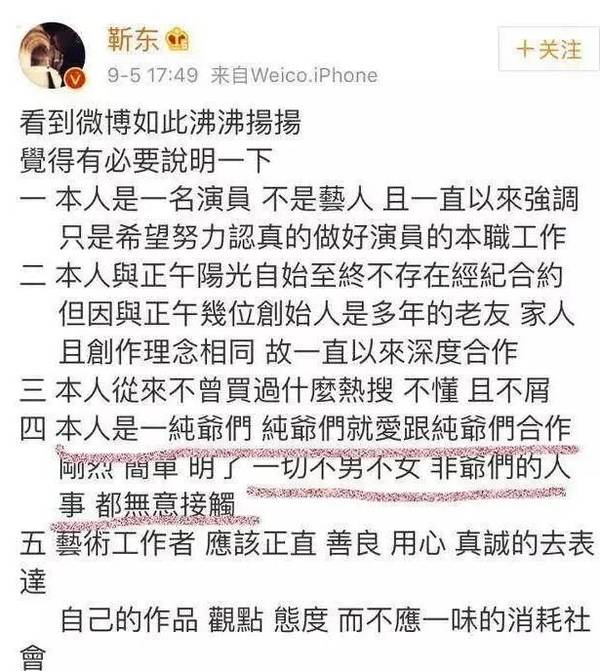 就是因為金星的吐槽靳東就不高興啦,于是,靳東在微博上發(fā),“一切不男不女,非爺們兒的人,都無意接觸”,哪個正人君子會說出這樣的話,還是“不男不女”這種帶有侮辱性直擊生理要害的話。 ?