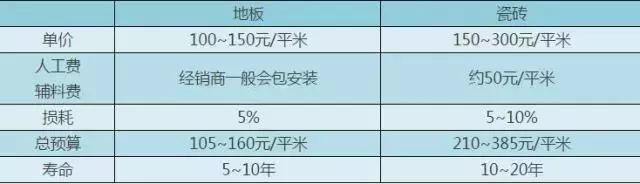 從上面這個(gè)表格可以看出,相同檔次的地板價(jià)格知識(shí)瓷磚的一半,但是地板的使用壽命也只有瓷磚的一半。如果打算不在換裝修,可以選用瓷磚。如果以后還有換房或是改造計(jì)劃的可以選用地板。