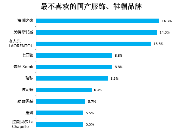 在所有國(guó)產(chǎn)服飾、鞋帽品牌中,受訪者對(duì)海瀾之家、美特斯邦威和老人頭這三個(gè)品牌的反感度排名前三,提及率分別為14.3%、14.0%和13.3%。