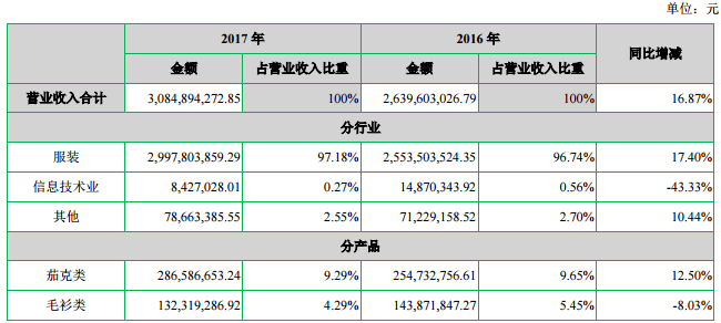 根據(jù)七匹狼公布的2017年報告數(shù)據(jù),分行業(yè)來看,服裝業(yè)收入29.98億元,也占營業(yè)收入的97.18%,同比增加17.40%;而信息技術業(yè)僅占營業(yè)收入的0.27%;其他類占2.55%。