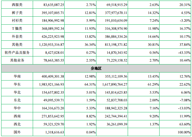 分產(chǎn)品來看,褲子類、T恤類、外套類的營收占比較為相近,分別為12.81%、11.93%、13.82%,其他類營收達11.21億元,占總營業(yè)收入的36.34%。
