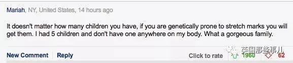 不過,有個(gè)美國(guó)網(wǎng)友對(duì)此表示反對(duì),她認(rèn)為這個(gè)跟生幾胎無關(guān),只跟基因有關(guān)。“這個(gè)不是因?yàn)槟闵硕嗌俸⒆樱歉愕幕蛴嘘P(guān)。我生了5個(gè)孩子,身上一條妊娠紋都沒有……”