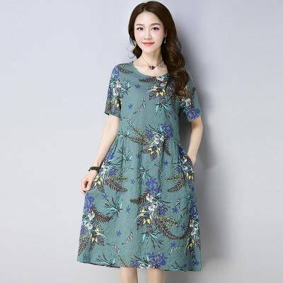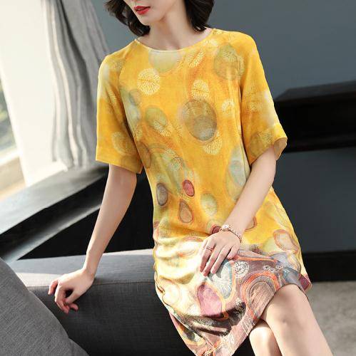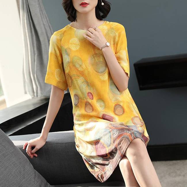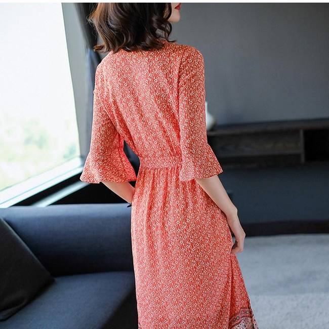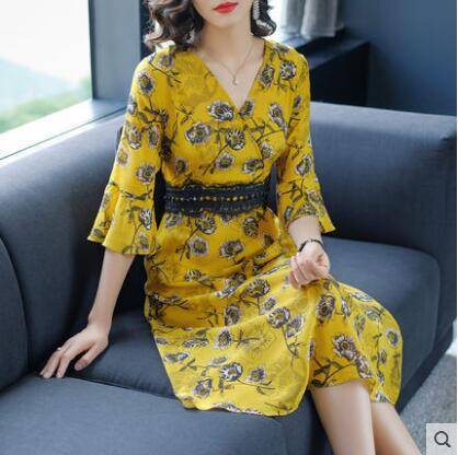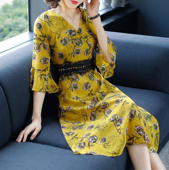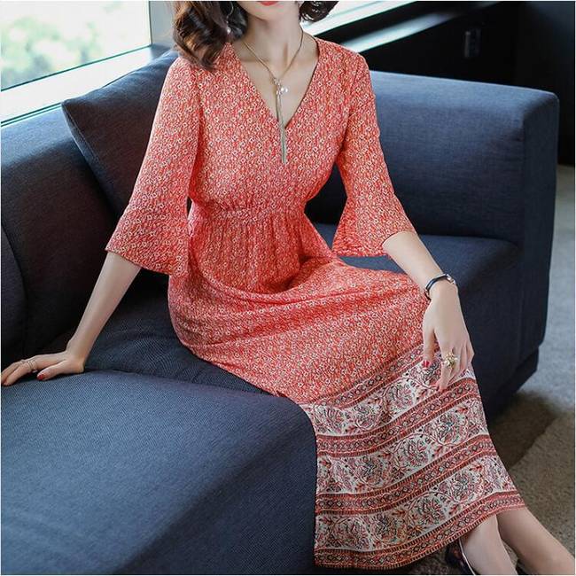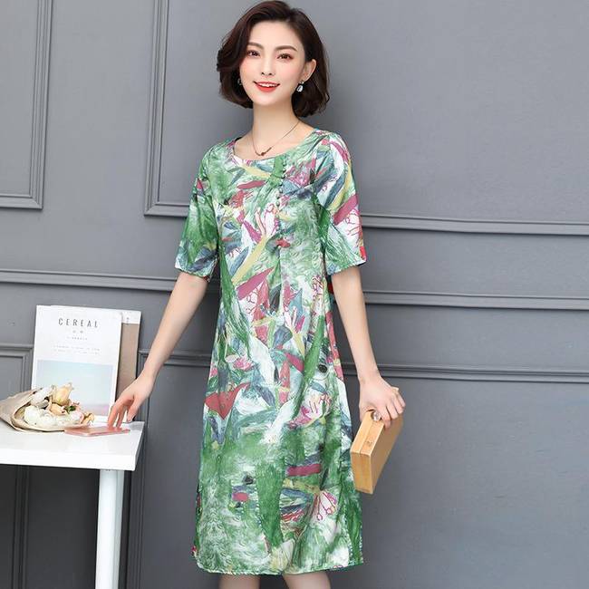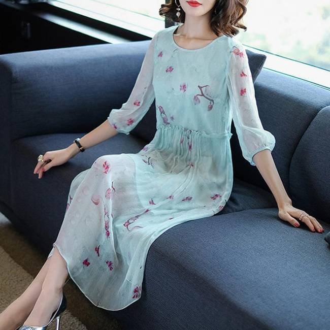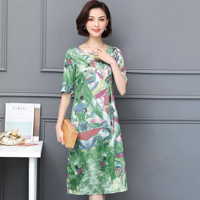 暢的線條,回頭率暴增,穿在身上顯檔次,凸顯優(yōu)雅氣質,時尚中袖設計,大面積印花圖案裝飾于裙面,女人味盡顯。