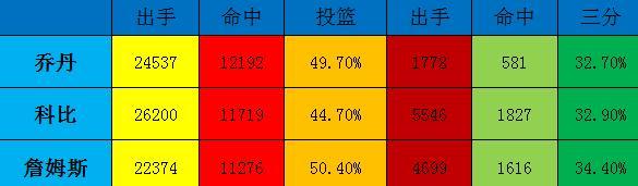 從進攻效率來看,喬丹和詹姆斯的進攻效率相對于科比來說高了不少,從外線球員的角度來說,喬丹和詹姆斯的命中率可謂是最頂尖級了。而三人的三分球都不是其最拿手的得分方式,都低于35%。從個人進攻效率來說,喬丹和詹姆斯更高。