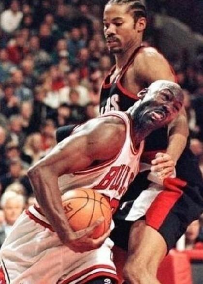 在場上的喬丹也留下了不少囧照,最囧的莫過于這張突破時的面部掙扎表情圖。很明顯可以從圖中看出喬丹發(fā)力后面部表情完全扭曲,加上舌頭吐出的模樣,有點像抽搐的病人。這和他往日在場上的瀟灑大相徑庭,相信幫主一定希望自己能夠刪了這張囧照。