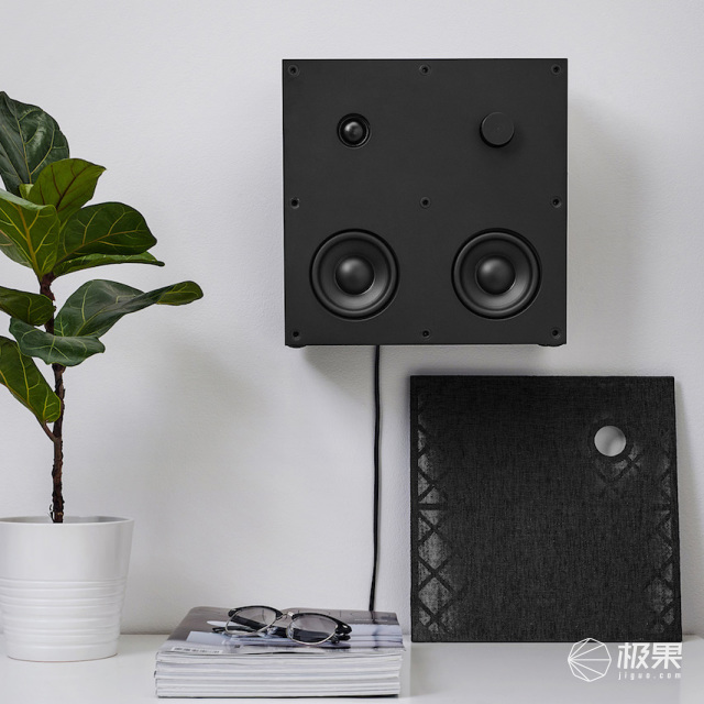 這款音箱造型方正,有大小兩個尺寸可供選擇,分別是20cm*20cm和30cm*30cm,在顏色上遵循簡約的風格,有黑色和白色兩個版本,并采用塑料外殼+灰色或者黑的滌綸編織物覆蓋的方式。