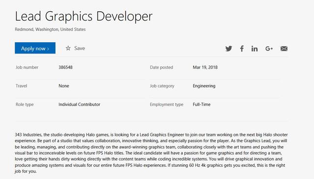 該招聘職位是圖像開發(fā)主管(Lead Graphics Developer),主要負(fù)責(zé)領(lǐng)導(dǎo)和管理圖像團(tuán)隊(duì),并與藝術(shù)團(tuán)隊(duì)親密合作,為未來的《光環(huán)》游戲帶來嶄新的視覺體驗(yàn)。其中還特意提到“若你對60幀4K圖像感興趣,那這份工作非常適合你”。該職位基本要求是7年以上的編程經(jīng)驗(yàn),其他要求則有7年以上的C++專業(yè)開發(fā)經(jīng)驗(yàn)、參與過本世代3A游戲的制作、擁有第八世代主機(jī)(即本世代主機(jī))的GPU編程經(jīng)驗(yàn)或DX11、DX12的開發(fā)經(jīng)驗(yàn)等。