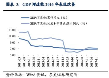 1)宏觀經(jīng)濟(jì)2017年表現(xiàn)向好,利好消費(fèi)。總體/批發(fā)和零售業(yè)GDP(不變價(jià))截至2017年12月不變價(jià)累計(jì)增長6.9%/7.1%(16年同期為6.7%/7.1%),總體增速穩(wěn)中有升。而作為經(jīng)濟(jì)增長先行指標(biāo)克強(qiáng)指數(shù)在2017年的整體表現(xiàn)來看,截至2017年12月累計(jì)增長11.46%,高于2016年同期的7.50%,反映出宏觀經(jīng)濟(jì)的樂觀前景。宏觀經(jīng)濟(jì)表現(xiàn)走強(qiáng)背景下,整體利好消費(fèi)類行業(yè)。