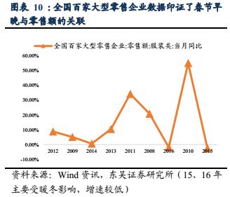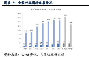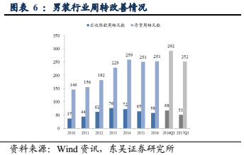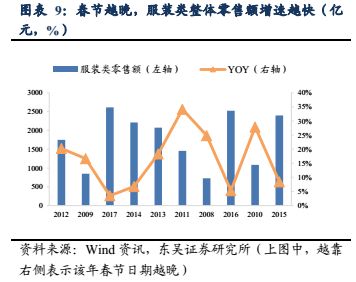 3)17年北方冬季較冷疊加18年春季較晚,利好紡服業(yè)整體銷售。一方面由于今年北方冬季較冷,各品牌17年四季度零售情況良好,我們認(rèn)為這將對各品牌17Q4報(bào)表收入帶來提振;另一方面18年春節(jié)較晚有望利好18年一季度銷售,這主要是由于元旦至春節(jié)之間往往是高毛利冬裝的銷售旺季,而春節(jié)的提前則會(huì)縮短這一黃金銷售時(shí)間段;同時(shí)春節(jié)之后由于假期的結(jié)束,消費(fèi)需求往往相對較淡,因此春節(jié)的前后對整個(gè)Q1的銷售有著較大的影響。我們從數(shù)據(jù)上也能觀察到這一情況的出現(xiàn)。除去受到暖冬影響的15、16年,其他年份這一趨勢均較為明顯。