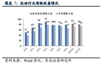 2)服裝行業(yè)2011年以來渠道調(diào)整持續(xù)至今,可見成效。給出這樣判斷的標(biāo)準(zhǔn)主要有三方面:1)主品牌門店數(shù)量基本停止收縮;2)同店恢復(fù)正增長;3)渠道庫存得到有效控制。包括女裝、男裝、家紡、運(yùn)動(dòng)行業(yè)在17年Q3的報(bào)表表現(xiàn)可以看到渠道庫存出清卓有成效、周轉(zhuǎn)明顯改善。