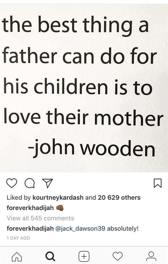 盡管包括臀姐在內(nèi)的一眾親屬并未在社交媒體上發(fā)聲,但科勒最要好的閨蜜Malika Haqq還是打破了沉默。她只發(fā)了一張圖,是NBA籃球教父約翰·伍登的名言:“一個父親能為孩子做的最好的事,就是愛他們的母親。”考特尼秒贊。