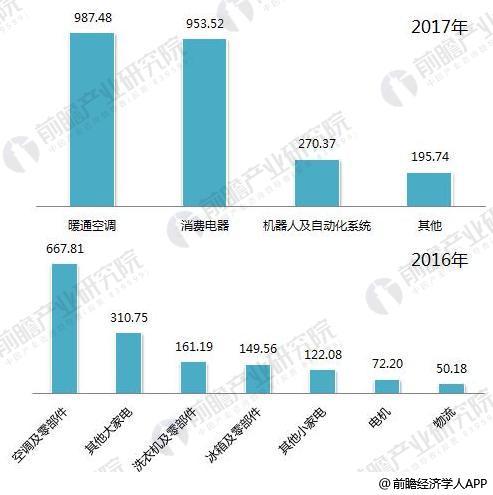 2017年,美的集團(tuán)對其業(yè)務(wù)結(jié)構(gòu)進(jìn)行了重新劃分,其中暖通空調(diào)、消費(fèi)電器分別實(shí)現(xiàn)987.48億元、953.52億元的營業(yè)收入,機(jī)器人及自動化系統(tǒng)營收實(shí)現(xiàn)270.37億元。較2016年有明顯改變。