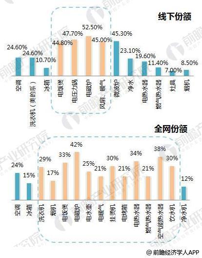 圖表5:2017年美的集團(tuán)各細(xì)分產(chǎn)品在線上、線下銷售額所占比重(單位:%)