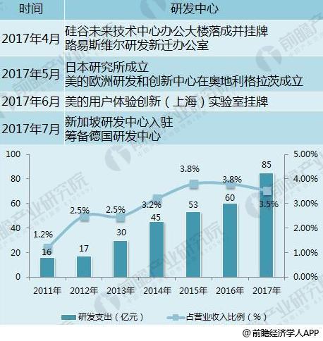 2016年末,美的已在全球8個(gè)國家設(shè)立了17研發(fā)中心;截至2017年末,美的全球已有20個(gè)研發(fā)中心,設(shè)立在包括中國在內(nèi)的9個(gè)國家。2017年,美的集團(tuán)在硅谷、路易斯維爾等地開設(shè)了新的技術(shù)研發(fā)辦公地點(diǎn),研發(fā)投入增至85億元,占營業(yè)收入的3.5%。