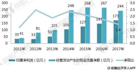 圖表10:2011-2017年美的集團(tuán)歸屬凈利潤、經(jīng)營活動現(xiàn)金凈流量與凈現(xiàn)比(單位:億元)