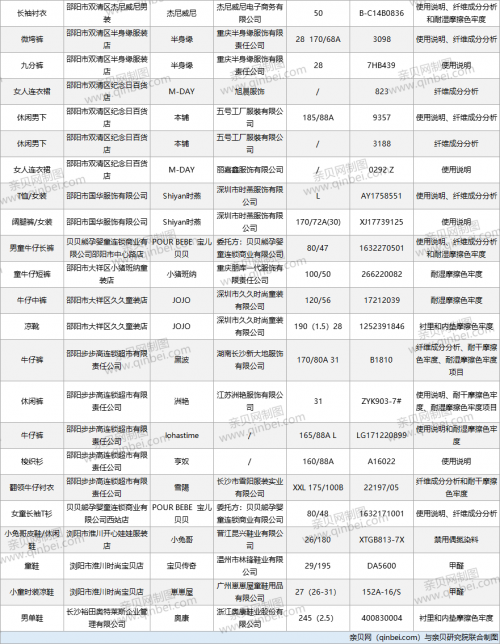 其中,由邵陽市大祥區(qū)小豬班納童裝店銷售的標(biāo)稱重慶朋庫一代服飾有限責(zé)任公司生產(chǎn)的小豬班納童牛仔短褲不合格;由貝貝熊孕嬰童連鎖商業(yè)有限公司邵陽市中心路店銷售的標(biāo)稱(委托方:)貝貝熊孕嬰童連鎖商業(yè)有限公司生產(chǎn)的POUR BEBE寶兒貝貝男童牛仔長褲不合格;由貝貝熊孕嬰童連鎖商業(yè)有限公司西站店銷售的標(biāo)稱(委托方:)貝貝熊孕嬰童連鎖商業(yè)有限公司生產(chǎn)的POUR BEBE寶兒貝貝女童長袖T衫不合格等等。