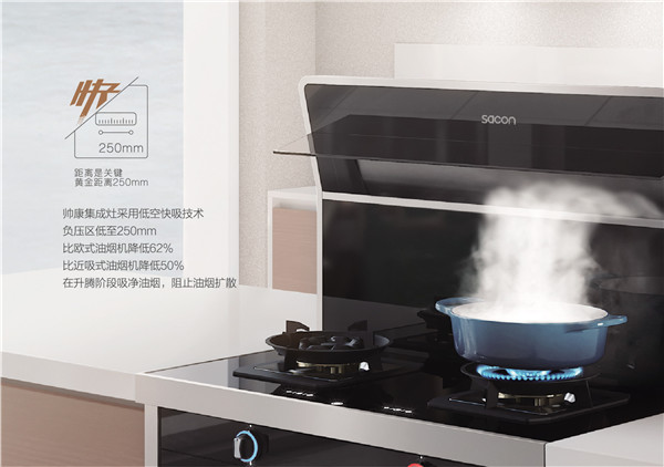 \u00A0 \u00A0 據(jù)了解,油煙出現(xiàn)會(huì)有產(chǎn)生、升騰、擴(kuò)散這三個(gè)階段,升起之后,控?zé)焻^(qū)就決定了油煙被吸走的程度。為快速吸凈油煙,帥康集成灶采用低空快吸技術(shù),負(fù)壓區(qū)低至250mm,比歐式油煙機(jī)降低62%,比近吸式油煙機(jī)降低50%,在升騰階段吸凈油煙,阻止油煙擴(kuò)散。