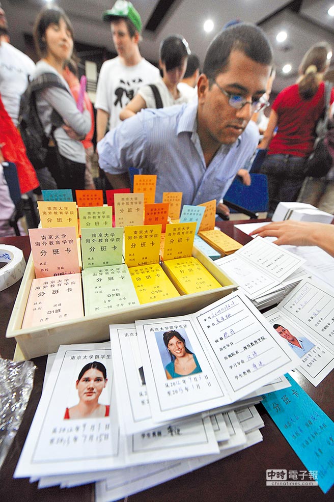 南京大學(xué)外國(guó)留學(xué)生新生報(bào)到入學(xué),一名學(xué)生領(lǐng)取留學(xué)生證等資料。(新華社資料照片)