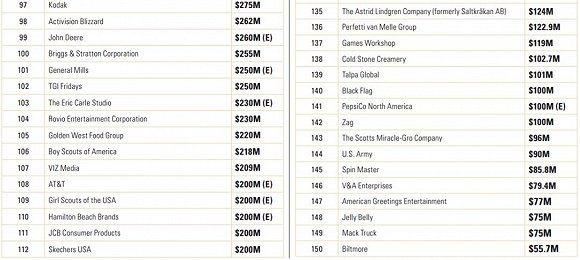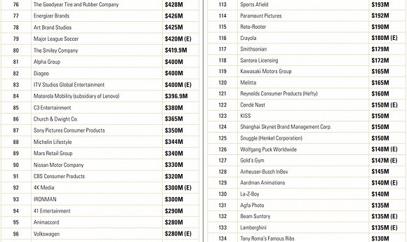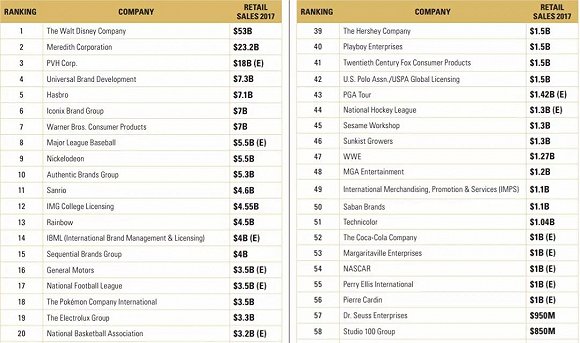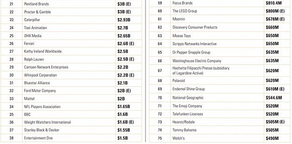 美泰、樂高、孩子寶、小豬佩奇出品方Entertainment One、汪汪狗出品方Spin Master等玩具公司都進入該榜單。孩之寶排名第5位,授權商品零售額達71億美元;美泰排名33位,授權商品零售額達20億美元;Entertainment One排名第38位,授權商品零售額達15億美元;Spin Master排名第145位,授權商品零售額達8.58億美元。樂高集團排名第60位。