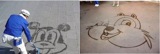 東京迪士尼的工作人員的基本功之一就是掃地,有一套完整的培訓流程,如要求掃地不能揚塵、如果有游客嘔吐了怎么處理等。這些都不多說了。最重要的人,掃地的一項基本功就是畫得一手好卡通人物,讓游客開心。