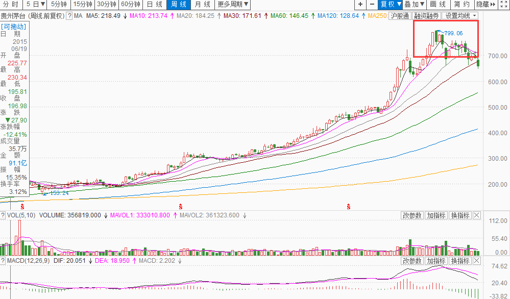 值得注意的是,2017年1月15日,貴州茅臺股價創(chuàng)下歷史新高799.06元,逼近800元關(guān)口,市值一度突破萬億元大關(guān)。有投資者笑稱:茅臺已經(jīng)不再是酒,而是“液體黃金”,具有金融屬性,可見其瘋狂。