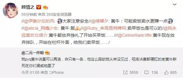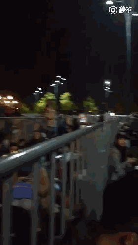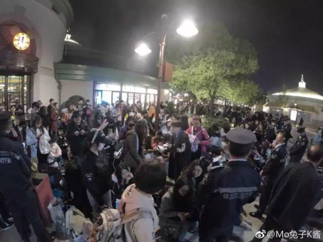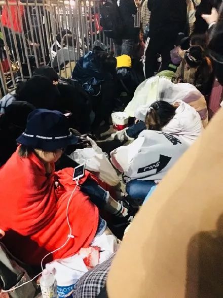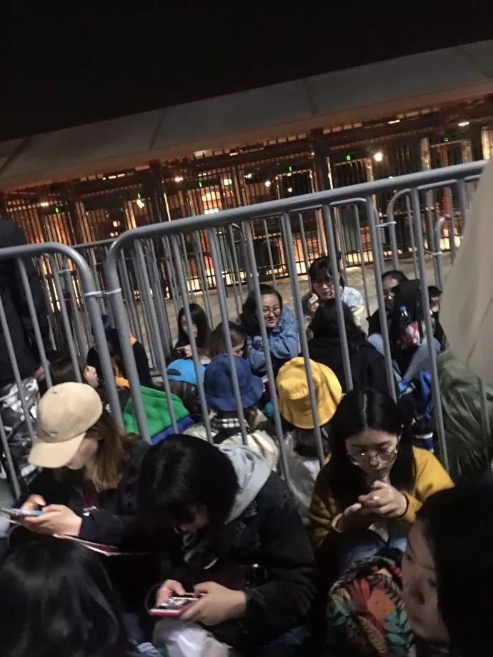 12點(diǎn)到凌晨1點(diǎn):這里已經(jīng)聚集了近萬(wàn)名粉絲,保安開(kāi)始圍起鐵欄桿分流。粉絲席地而坐,開(kāi)始了通宵露營(yíng)。之后半個(gè)小時(shí)內(nèi),說(shuō)好原本不夜排的保安,接到指令,開(kāi)始一次5個(gè)的放人。