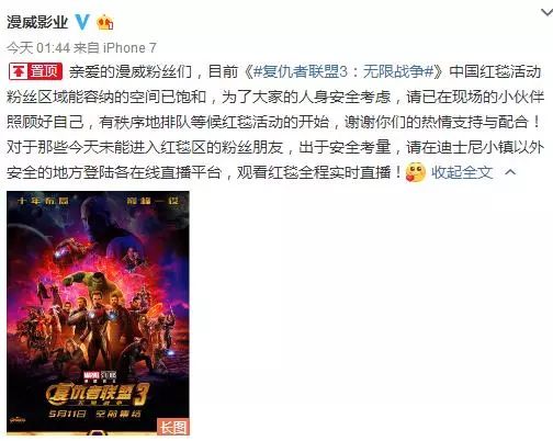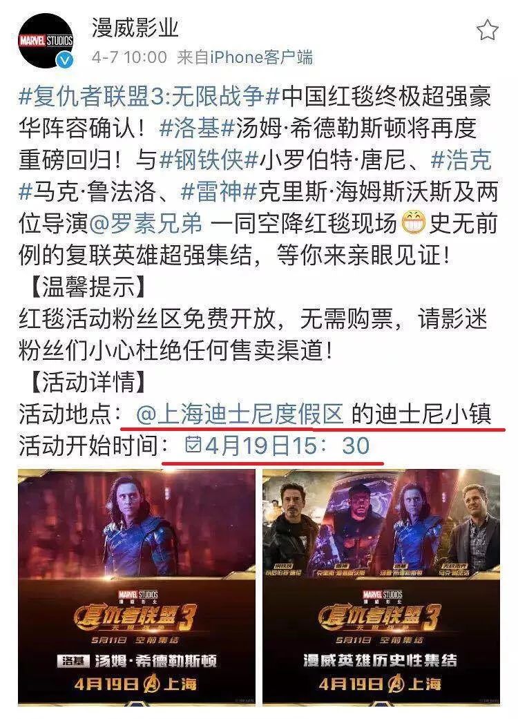 今天,《復(fù)仇者聯(lián)盟3:無(wú)限戰(zhàn)爭(zhēng)》將在上海迪士尼舉辦首映禮(放片段30分鐘),多位巨星到場(chǎng)。結(jié)果昨晚10點(diǎn)后已有大量粉絲前往!