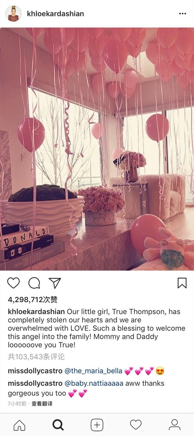 “我們的小小女孩兒,True Thompson,已經(jīng)完全把我們的心給偷走了,每個人都被滿滿的愛意包圍。能迎來一位小天使進(jìn)入我們家,真是一件莫大的祝福。媽咪和爹地好愛你啊True!”