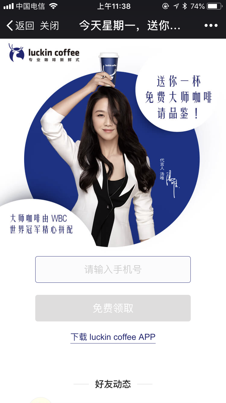 不知大家有沒有注意到,近來朋友圈頻繁被一個“請你喝咖啡”的鏈接刷屏,繼續(xù)細(xì)看,品牌logo是一個鹿角的模樣,藍(lán)色,看起來顏值頗高,代言人是張震和湯唯。作為一個偽咖啡愛好者,Luckin Coffee瑞幸咖啡,你強烈引起了我的注意。